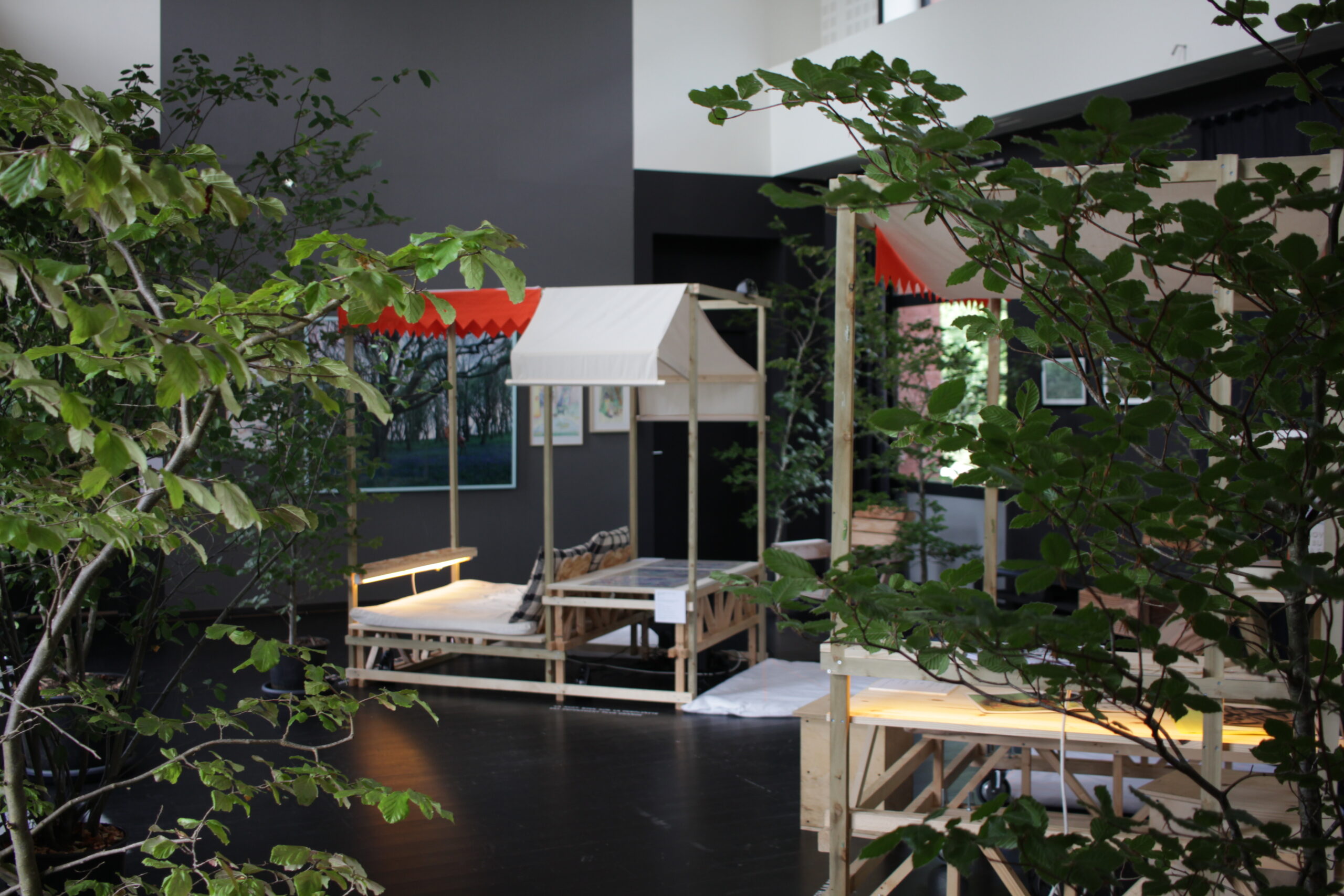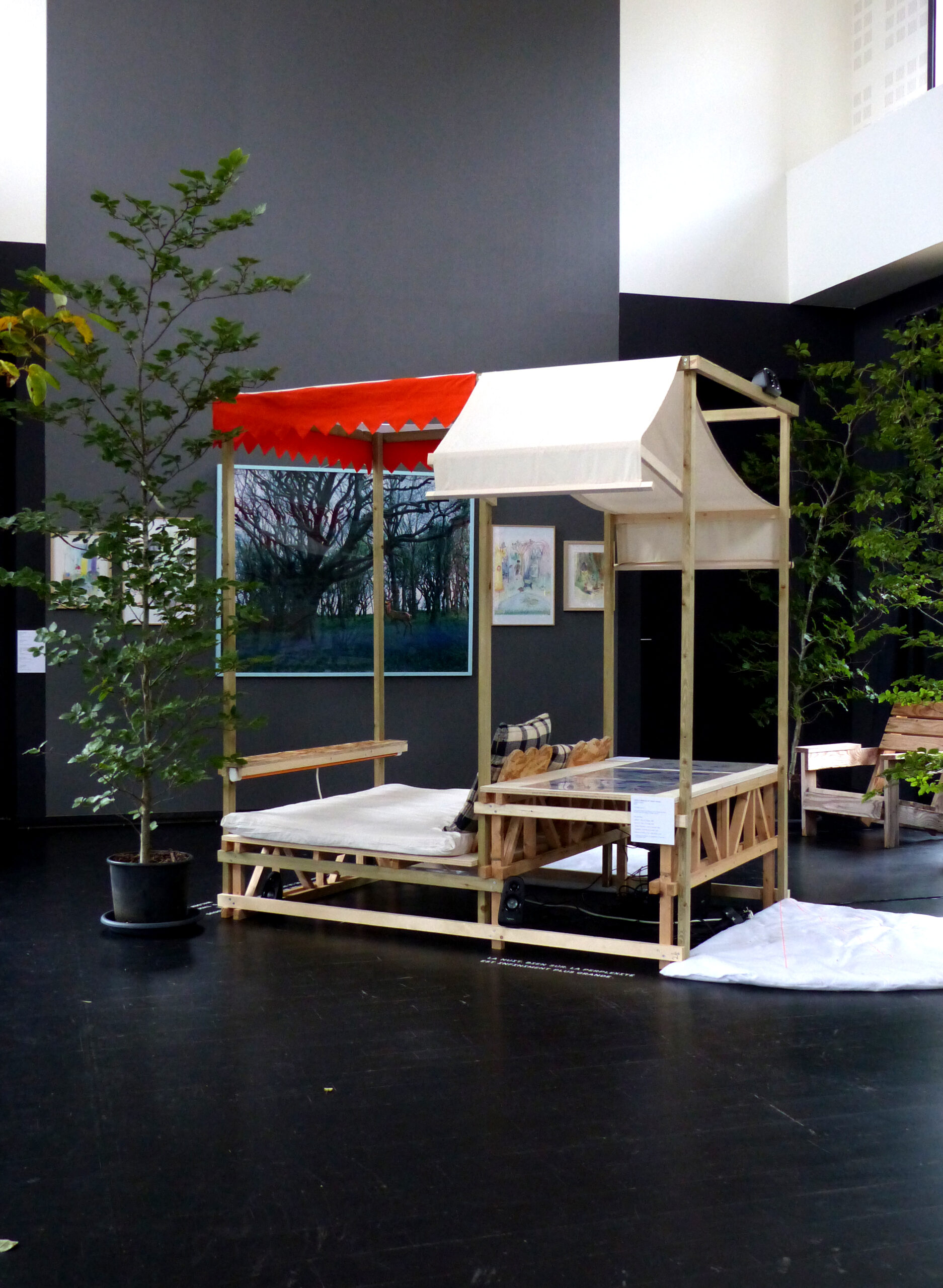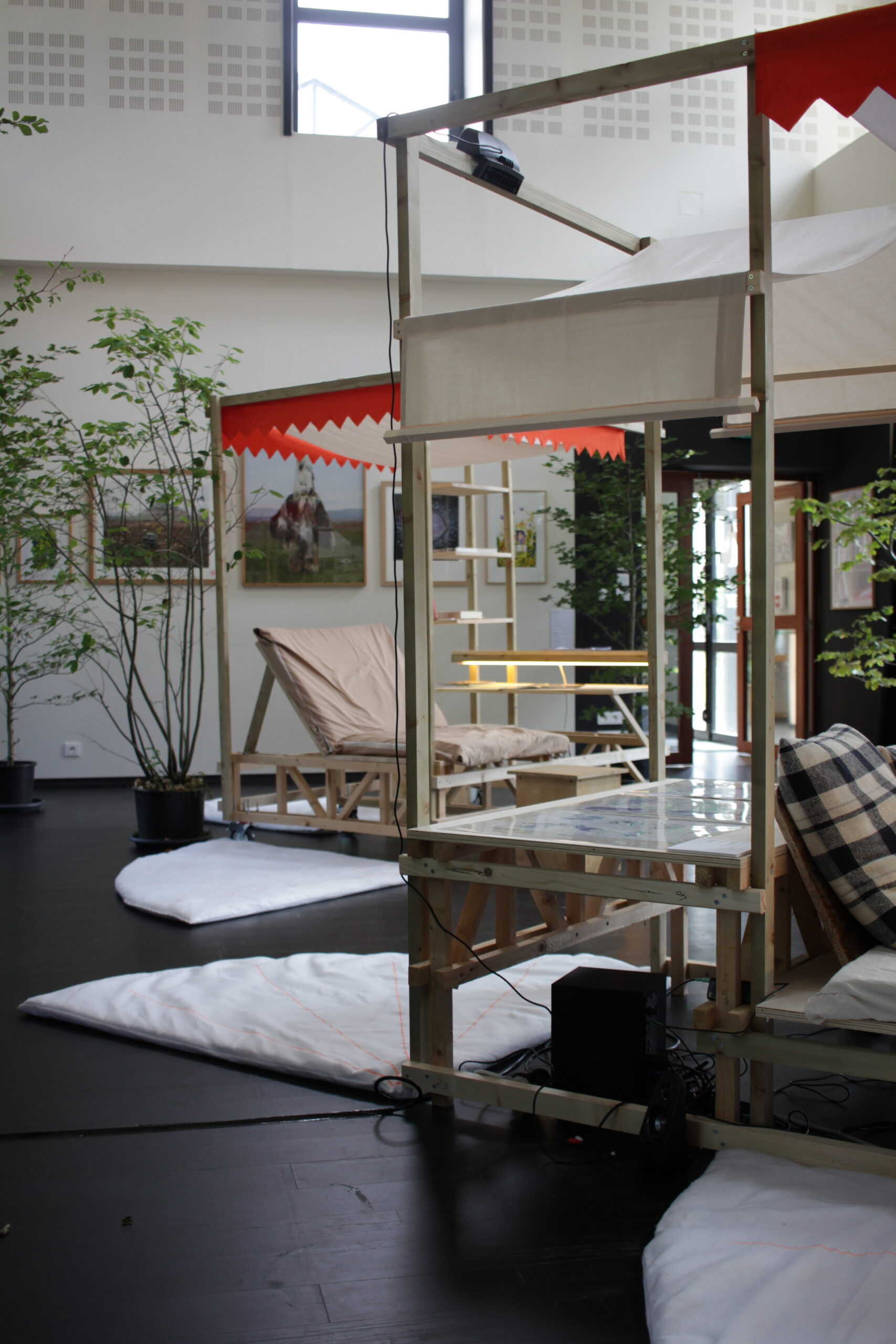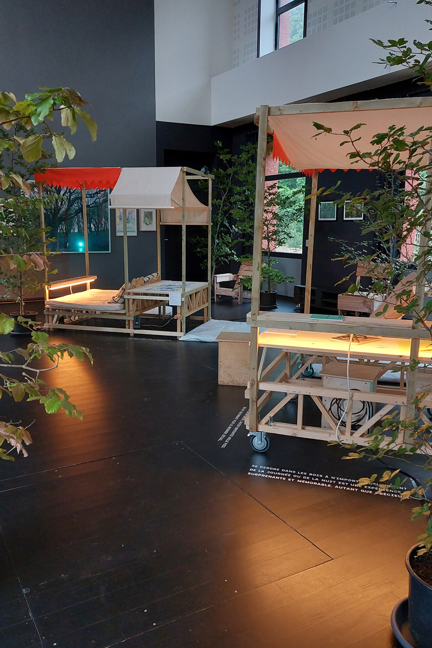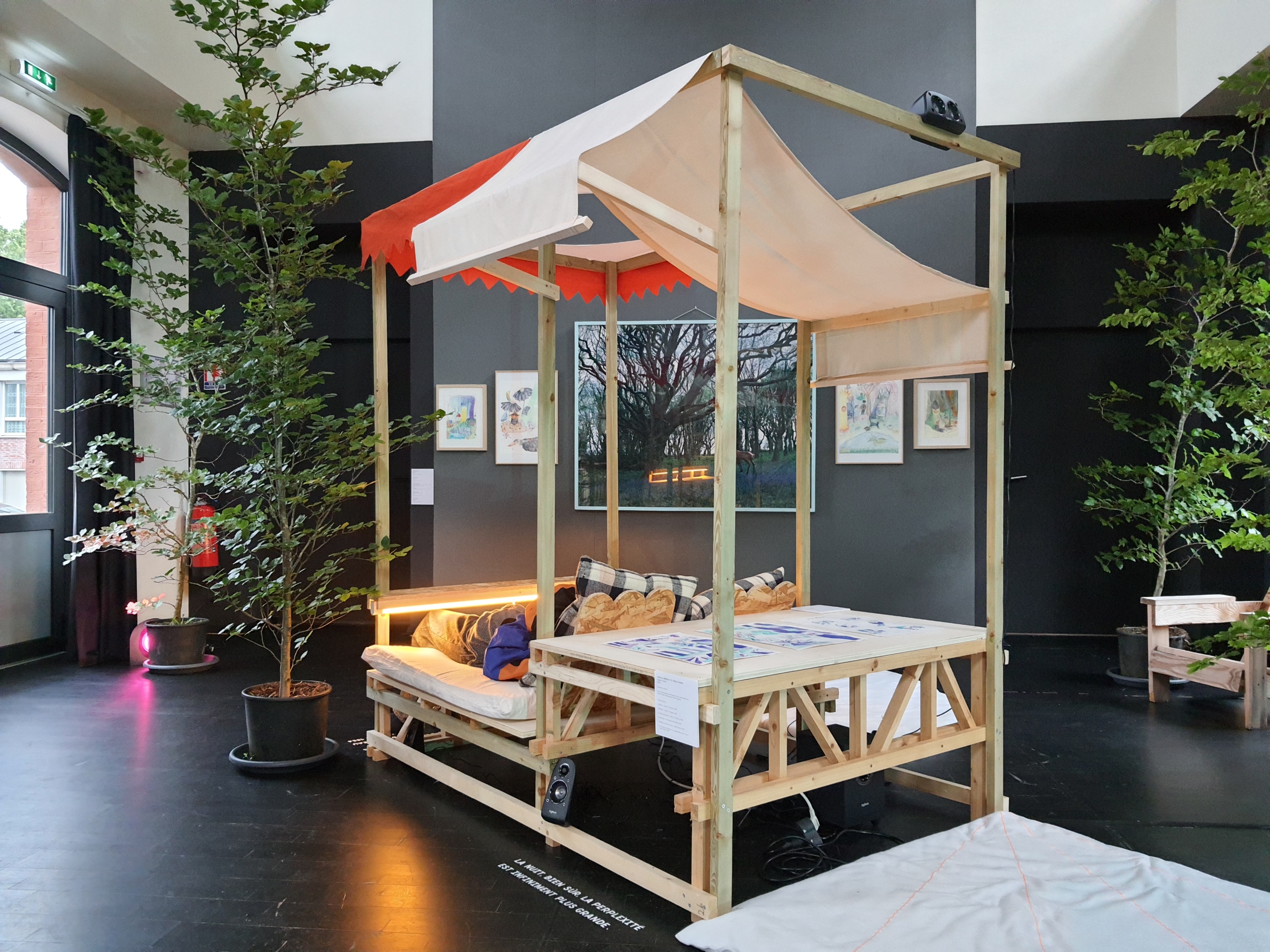 Structure nomade et de repos imaginée dans le cadre des Nuits de Forêts et de l’exposition « Forest-Forêt » du 18 juin au 29 juillet 2022 à La Gare Centre d’Art et de Design, au Relecq-Kerhuon.